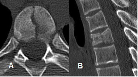 A: TAC axial y B: TAC reconstrucción sagital. Fractura con compromiso de la columna anterior y media, quedando el cuerpo vertebral dorsal dividido en 2 mitades.