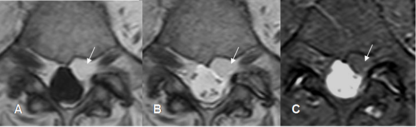 A: RM axial en T1,  B: RM axial en T2 y C: RM axial en STIR. Imagen paramediana izquierda, que comprime el saco dural y sigue la señal de intensidad e la grasa. Corresponde a lipoma extradural.