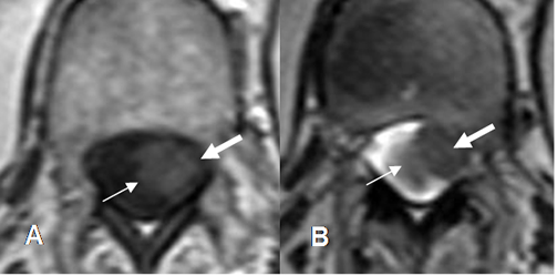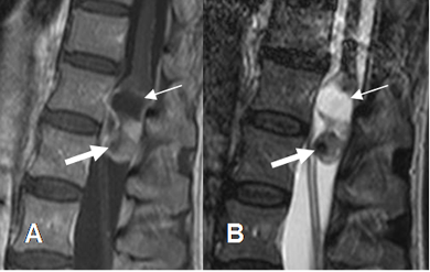 A: RM sagital en T1 con contraste y B: RM sagital en T2. Lesión tumoral que expande el cono medular. Muestra porción quística en la parte superior (Flechas delgadas) y porción sólida en la parte inferior. con realce heterogéneo del contraste. (Flecha gruesa). En su interior hay zona hipointensa que corresponde a hemosiderina, por sangrado antiguo.