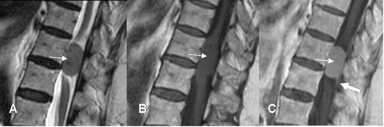 A: RM sagital en T2, B: RM sagital en T1 simple y C: RM sagital en T1 con contraste. Igual paciente anterior. Lesión ovalada y de bordes bien definidos, que comprime la medula espinal y realza con el contraste. En C se aprecia cola dural (Flecha gruesa), por meningioma intradural extramedular.