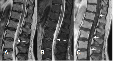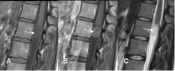 A: RM sagital en T1 simple, B: RM sagital en T1 con contraste y C: RM sagital en T2. Lesión expansiva en el cono medular, hipointensa en T1, hiperintensa en T2 y que realza con el contraste, sin porción quística, por astrocitoma.