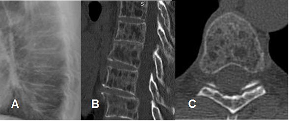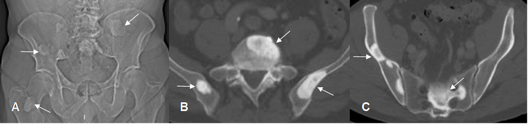 A: Rx AP, B y C: TAC axial. Múltiples lesiones densas en los huesos iliacos, columna y fémur derecho, por metástasis blásticas de neoplasia pulmonar.