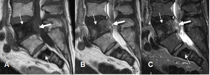 A: RM sagital en T1, B: RM sagital en T2 y C: RM sagital en STIR. Lesiones hipointensas en todas las secuencias de tumor de pulmón, en L4 y el sacro, por alto contenido fibroso. En L4 hay masa de tejidos blandos, que ocupa el canal medular. (Flechas gruesas).