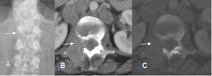 B: TAC axial en ventana de tejido y C: en ventana osea. Enfermedad metastásica con destrucción del pedículo vertebral, un hallazgo descrito clásicamente.