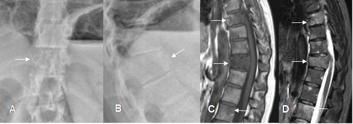 C: RM sagital en T1 y D: RM sagital en STIR. Además de D12, se encuentran lesiones que comprometen otros cuerpos dorsolumbares, por enfermedad metastásica.