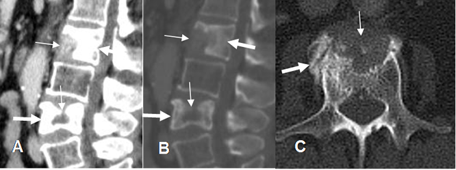 A: TAC reconstrucción sagital en ventana de tejido, B: TAC reconstrucción sagital en ventana ósea y C: TAC axial. Múltiples lesiones líticas (Flechas delgadas) y blásticas (Flechas gruesas), por neoplasia de mama.