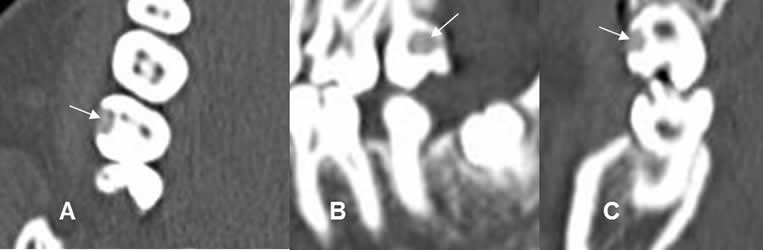 En el TAC se identifican como focos de pérdida de la dentina y el cemento, que se extienden de la superficie a los dientes. (1, 4). (Fig 34 y 35).