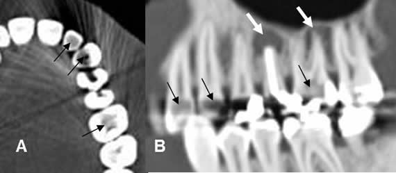 A: TAC axial y B: TAC reconstrucción sagital. Varias zonas hipodensas que reemplazan el cemento y la pulpa de los dientes (Flechas negras) y corresponden a caries. Existe perilucencia apical asociada, por enfermedad endodental (Flechas gruesas blancas).