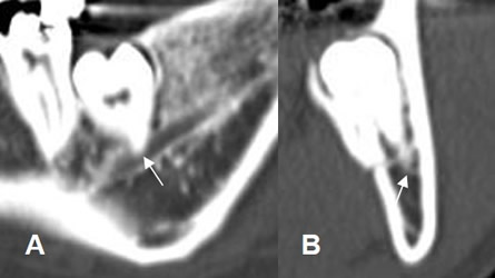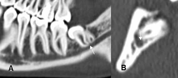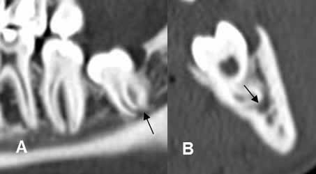 A : TAC reconstrucción sagital y B: TAC reconstrucción transversal. Raíz de la pieza 48, que deforma el contorno de la parte supero-interna del canal mandibular.