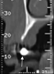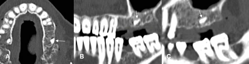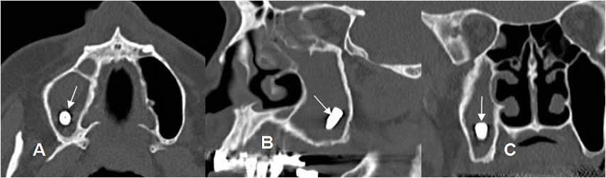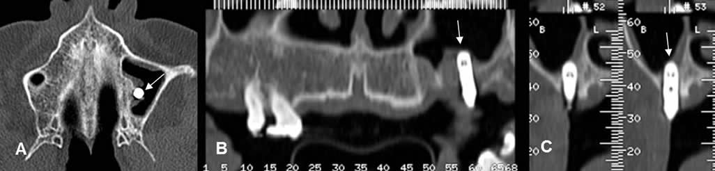 A: TAC axial, B: TAC reconstrucción sagital y C: TAC reconstrucción coronal. Tornillo de un implante suelto, dentro del seno maxilar.