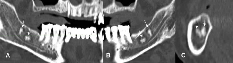 A y B: TAC reconstrucción panorámica y C: TAC reconstrucción coronal.