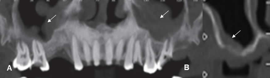 A: TAC reconstrucción transversal del maxilar y B: de la mandíbula.