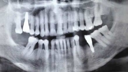 Ausencia de varias piezas dentales. También hay implantes colocados, en el lado derecho del maxilar y el izquierdo de la mandíbula.