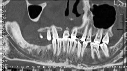 Reconstrucción panorámica, obtenida de un dentascan. Ausencia de varias piezas dentales.