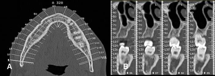 A: Topograma y B: Reconstrucciones ortogonales. Cortes obtenidos con el programa dentascan, que permite caracterizar la región de interés.