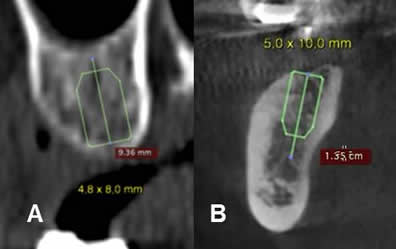 A y B: Dentascan reconstrucciones ortogonales. Simulacros del tamaño del implante, que se pueden hacer con el programa dentascan y que orientan al dentista para escoger el tamaño mas apropiado.