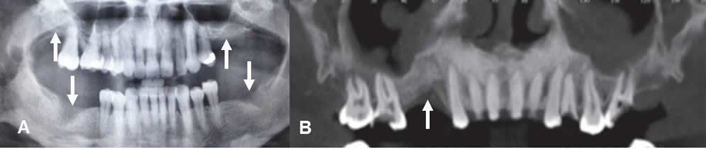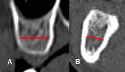 A: TAC reconstrucción transversal del maxilar y B: de la mandíbula. Ancho del hueso, medido entre los bordes internos de las corticales, en la región mas estrecha.