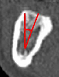 TAC reconstrucción transversal de la mandíbula. Angulo de inclinación, trazado entre la vertical y el eje de la cresta ósea.