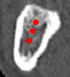 TAC reconstrucción transversal. Varias mediciones de la densidad ósea, sobre el trayecto del implante.