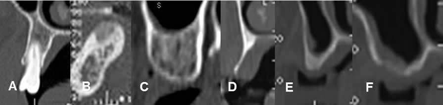 Las imágenes coronales oblicuas son las mas importantes del dentascan. Ayudan a identificar la forma y angulación del hueso alveolar y medir su altura y espesor. (2, 10). (Fig 22).