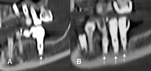 A y B: TAC reconstrucción sagital. Implantes mandibulares, con adecuada óseo-integración