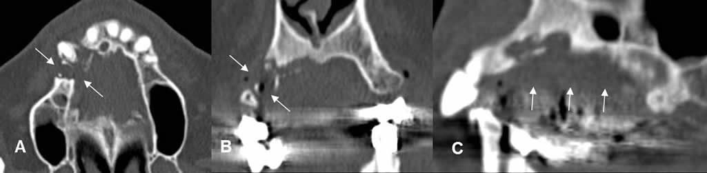 A: TAC axial, B: TAC reconstrucción coronal y C: TAC reconstrucción sagital. Infección del implante, el cual se ha caído. Hay gran lesión lítica que destruye el maxilar, por osteomielitis.