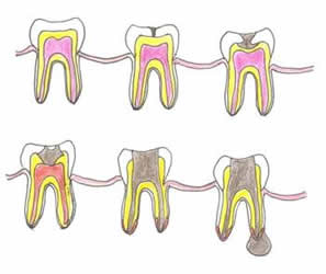Inicialmente se produce una caries, que progresa y compromete la cámara pulpar.