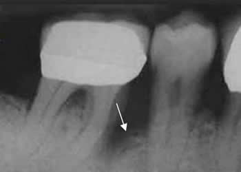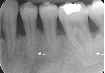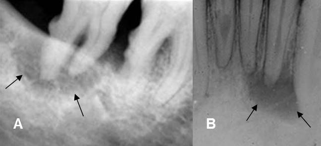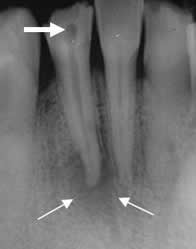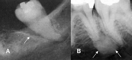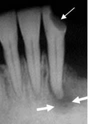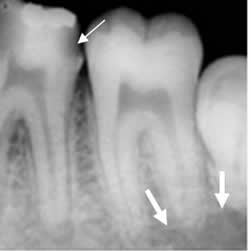 Rx periapical. Disminución de la densidad del hueso alveolar, que rodea las raíces dentales, de bordes mal definidos. Clínicamente hay dolor y cambios inflamatorios de los tejidos blandos, por la formación de absceso. (Flechas gruesas). En otra pieza se identifica caries. (Flecha delgada).