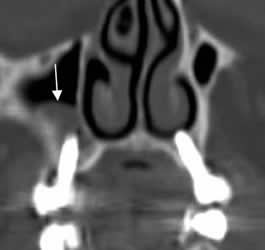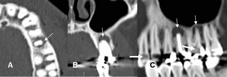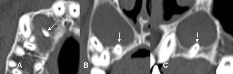 Un engrosamiento mucoso, asociado a dehiscencia del piso del seno maxilar por encima de un diente cariado o con enfermedad periodontal, es altamente sugestivo de origen odontogénico. También un diente que no ha erupcionado en el seno maxilar, puede ser un nido de la sinusitis. (1, 4). (Fig 53, 54 y 55).