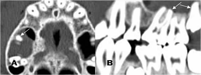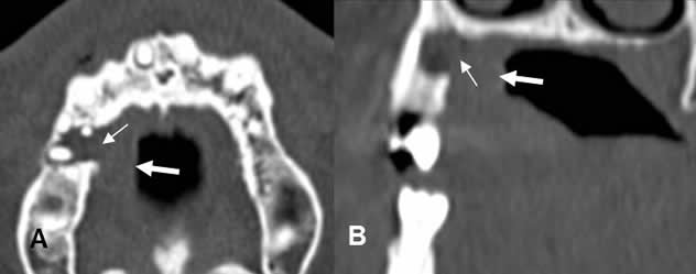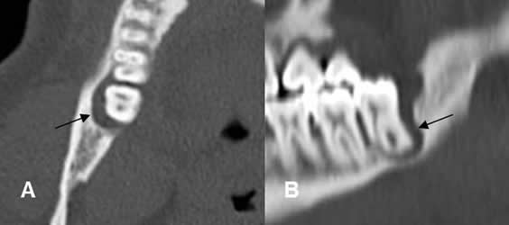 A: TAC reconstrucción y B: TAC reconstrucción coronal. Enfermedad periapical, con destrucción ósea (Flechas delgadas) y prominencia de los tejidos blandos, hacia la superficie lingual (Flechas gruesas), por la formación de absceso periapical.