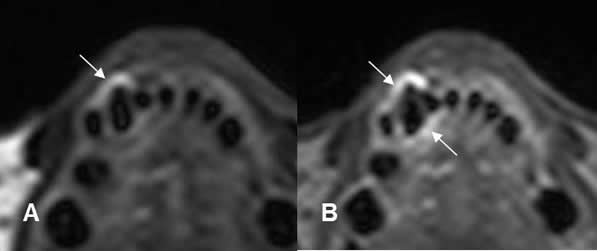 A: RM axial en T2 y B: RM axial en STIR. Cambios inflamatorios y aumento del espacio periapical, por enfermedad periodontal.
