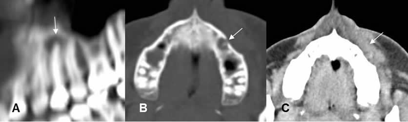 B: TAC axial. Enfermedad periapical, en ambos maxilares. En el lado izquierdo hay erosión ósea, por osteomielitis asociada.