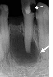 Rx periapical. Se identifica caries. (Flecha gruesa). Extensión periapical de la infección, con disminución de la densidad del hueso que rodea las raíces. (Flechas delgadas).