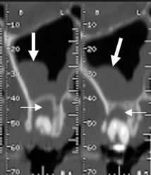 TAC reconstrucción coronal. Complicaciones de implantes. En el lado derecho hay perforación del piso del seno maxilar, con sinusitis secundaria. En el izquierdo, el extremo del implante se proyecta sobre la fosa nasal, por debajo del cornete inferior.