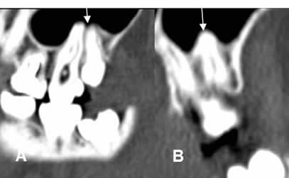 A: TAC reconstrucción sagital y B: TAC reconstrucción coronal. Raíces de los dientes dentro del seno maxilar, pero sin cambios inflamatorios asociados.