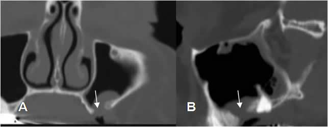 A: TAC reconstrucción coronal y B: TAC reconstrucción sagital. Engrosamiento en la mucosa del seno maxilar, con defecto óseo del piso y comunicación con la cavidad oral, por la formación de fístula.