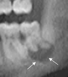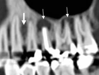 TAC reconstrucción sagital. Lesiones radiolúcidas y redondeadas, que rodean las raíces y corresponden a quistes radiculares. (Flechas delgadas). Adicionalmente existe aumento del espacio periapical, por enfermedad periodontal. (Flecha gruesa).