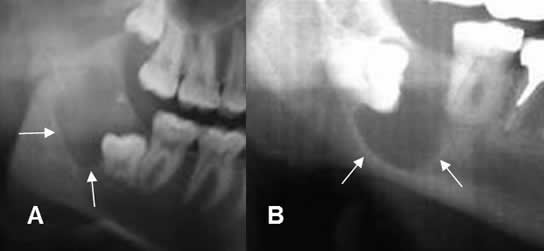 Se identifica como una lesión unilocular, radiolúcida y de bordes definidos, que se asocia a un diente impactado. Las lesiones son indistinguibles radiológicamente, de un quiste dentígero y si es multilocular o con crecimiento agresivo, no se puede diferenciar de un ameloblastoma. (17). (Fig 67).
