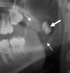 Ortopantografía. Lesión quística, de bordes escleróticos y bien definidos en la rama mandibular. (Flechas delgadas). En su interior se identifica una pieza dental. (Flecha gruesa).