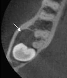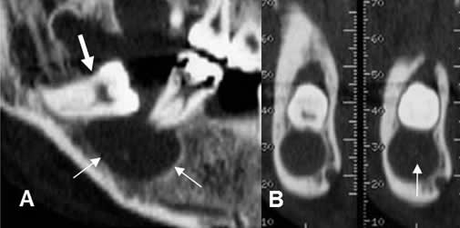 A: Panorámica de dentascan y TAC reconstrucción transversal. Molar incluido y horizontalizado, (Flecha gruesa) con lesión quística, excéntrica y en relación con la corona. (Flechas delgadas).