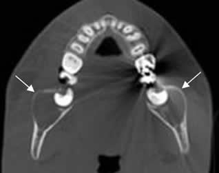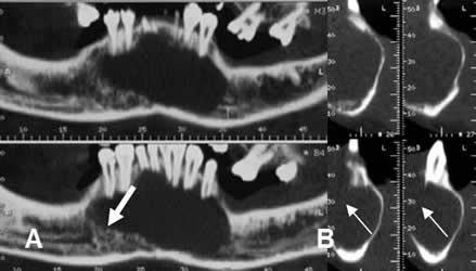 A: Panorámica de dentascan y B: TAC reconstrucción transversal. Lesión lítica, unilocular, bordes mal definidos (Flechas gruesa) y que crece por expansión, a nivel de la línea media y que ocasiona ruptura de la cortical. (Flechas delgadas).