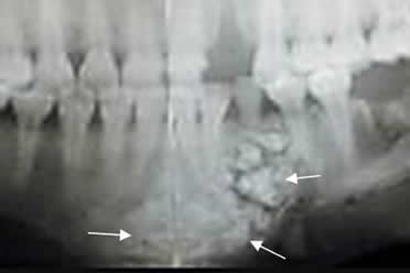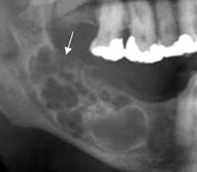 Ortopantografía. Lesión quística y multilocular, de septos delgados, en el cuerpo de la mandíbula. En la parte superior se aprecia, erosión de la cortical del hueso. (Flecha delgada).
