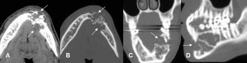 A: TAC en ventana de hueso, B: TAC axial en ventana de tejido, C: TAC reconstrucción coronal y D: TAC reconstrucción sagital. Lesión lítica y de comportamiento agresivo, que compromete la sínfisis y cuerpo de la mandíbula, con masa asociada de tejidos blandos.