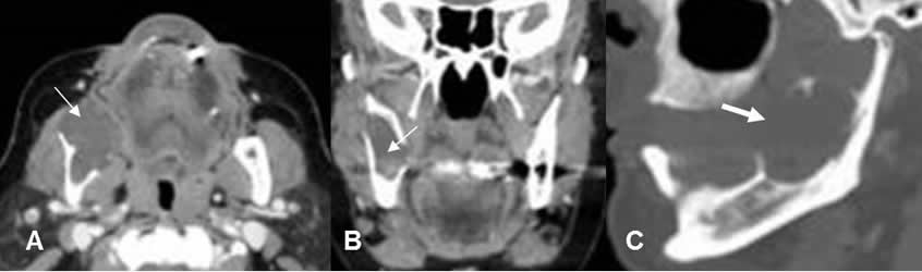 A: TAC axial y B: TAC reconstrucción coronal en ventana de tejido y C: TAC reconstrucción sagital, en ventana de hueso. Masa de tejidos blandos, que expande el ángulo de la mandíbula. (Flechas delgadas). Esta lesión ocasiona ruptura de la cortical y corresponde a ameloblastoma. (Flecha gruesa).