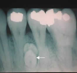 Son menores de 1 cm, se asocian a un diente cariado y puede ocasionar reabsorción de la raíz. En el centro de la lesión, se identifica la raíz del diente. (6, 17). (Fig 56 y 57).