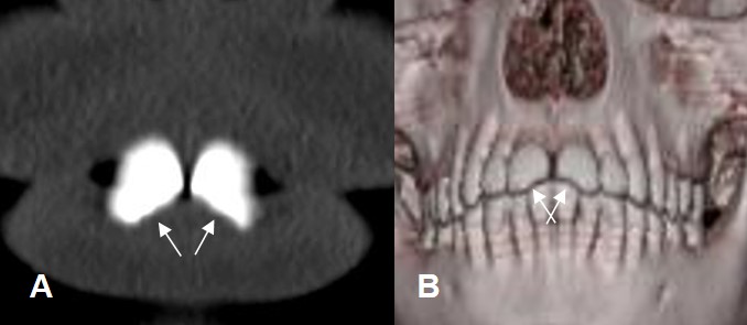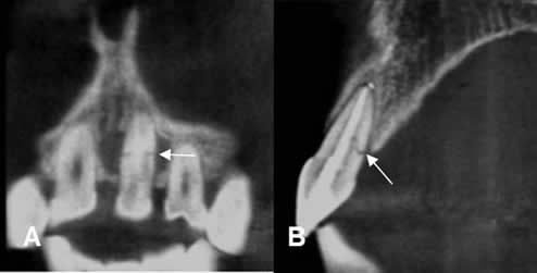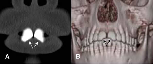 A: TAC reconstrucción coronal y B: TAC reconstrucción 3 D. Trauma directo, que produjo fractura en la parte medial, de ambos incisivos. (Flechas).