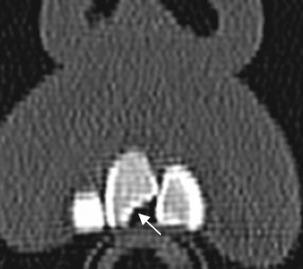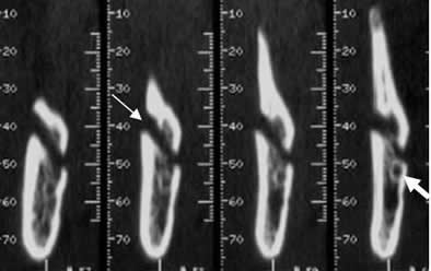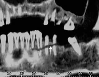Dentascan reconstrucción transversal. Fractura en sentido oblicuo, de la mandíbula. (Flecha delgada). Pasa por encima del canal dental, el cual permanece íntegro. (Flecha gruesa).