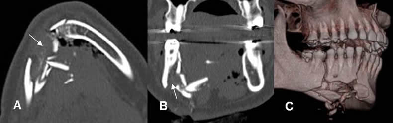 A: TAC axial, B: TAC reconstrucción coronal y C: TAC reconstrucción 3 D. Fractura conminuta, que afecta el borde inferior de la sínfisis mandibular. Por su localización, debe sospecharse lesión del canal dentario.