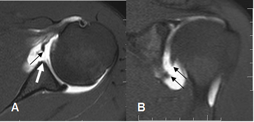 A: ArtroRM axial en STIR. Lesión de Bankart (Flecha gruesa), en asocio con ruptura del LGHM. (Flecha delgada).