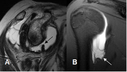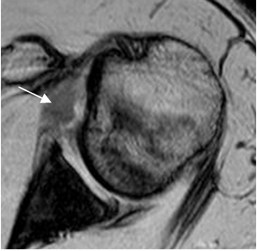 Para su diagnóstico se requiere de ArtroRM. En los cortes coronales, el receso axilar adquiere forma de “J” invertida. (Fig 78 A).
